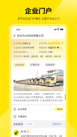 危司机平台运用互联网、人工智能算法、大数据等技术,通过云SAAS系统让危运公司的管理变得更轻松,让企业赚取更多利润。平台连接优质的危运企业,打造线上危运物流园,建立覆盖全国的落地网点,让驾驶员在返程时不再空跑,生活更加美好。持续推动危运行业向数字化、智能化升级,实现更高效的运输服务。通过危司机平台,企业可以更好地管理资源,提升运输效率,实现共赢局面。