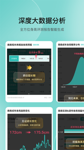 除了记录和预测身高数据,高小鹿身高簿还提供了身高对比功能,通过大数据分析,将孩子的身高数据与同龄孩子的身高数据进行比较,让家长们更清楚地了解孩子的身高发育情况是否符合正常范围。这种对比可以帮助家长及时发现孩子身高发育异常,及时进行调整和干预。