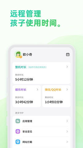 亲情守护是一款帮助家长更好地监督和引导孩子手机使用的应用,建立更加和谐的家庭关系,让孩子在健康的环境中成长。通过亲情守护,家长可以更加放心地将手机交给孩子使用,也能够更好地了解和关心孩子的成长过程。希望亲情守护能够成为家庭中的好帮手,让家庭关系更加和谐美满。