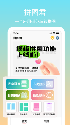 拼图君集竖向拼图、横向拼接、聊天记录拼图、网格拼图、台词字幕拼接、自由拼接、布局拼接等多种功能于一体,成为了一款全能的图片拼接工具。用户可以根据自己的需求选择不同的拼图方式,还可以享受到拼图君不定期更新的超好看模板,让创作更加轻松和有趣。
