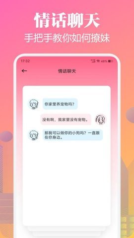 软件操作简便,用户无需具备专业背景即可轻松上手学习。提供分类学习和情话聊天实践功能,帮助用户高效掌握恋爱聊天技巧。恋爱聊天话术资源全面覆盖各种场景和需求,满足不同用户的个性化学习需求。界面设计简约而不失美观,提升用户体验感。