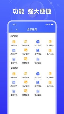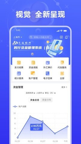 交行云跨行app是由自主研发、拥有完全自主知识产权的统一资金集中管理平台,可为企业提供丰富的资金管理功能以及特色附加服务。交行云跨行为企业整合多样金融资源、深度优化资源配置、提高资金运营效率、降低财务成本及风险,鼎力支持企业提升财务管理精益化、集约化、智能化水平。