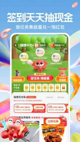 用户可以通过每日签到抽取现金,完成任务积攒能量,还可以兑换大额红包,用于购物时直接抵扣。一淘还能帮助用户发现同款优惠,获取商品的历史折扣信息,并及时提醒用户商品降价的情况。每天都会更新今日超划算、品牌特卖等官方补贴活动,用户可以参与大牌日领取专享优惠券,完成任务还能兑换大额红包。逛一淘,省更多!