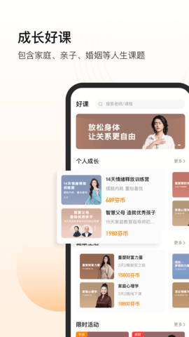 每周主题直播、海量有声书、大师课等课程都可以免费学习,您还可以参与线下工作坊、幸福研习活动、互动学习社群等。芬空间为您提供一个全方位的学习平台,让您不断进步,与志同道合的人一同成长。