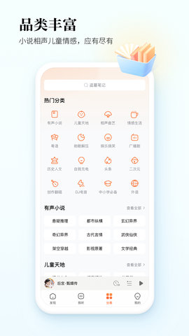作为酷狗音乐旗下的一款优秀听书APP,酷狗听书汇聚了声小说、广播电台、名家评书、相声小品、助眠解压、历史人文等多样内容,用户可以随时随地畅听海量音频资源。在【娱乐搞笑】板块中,用户可以欣赏DJ歌曲推荐、吐槽大会、欢乐集结号、搞笑段子、曹晨脱口秀等内容,放松心情,享受欢乐时光。而【有声小说】板块则提供了盗墓笔记、鬼吹灯经典系列、斗破苍穹、凡人修仙传、豪门龙婿、超级医仙、重生成了小福妻、遮天、斗罗大陆II绝世唐门等热门小说,满足用户对于听书的需求。