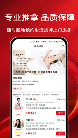 摩耶上门按摩APP为用户提供便捷高品质的上门按摩服务,24小时全天候服务,随时随地满足用户需求。通过平台媒介的作用,连接消费者和服务商,让用户享受到更加便捷的生活方式。用户可以在软件中体验各种按摩模式,调节个性化服务,改善身体状况,缓解压力,享受专业的推拿服务。