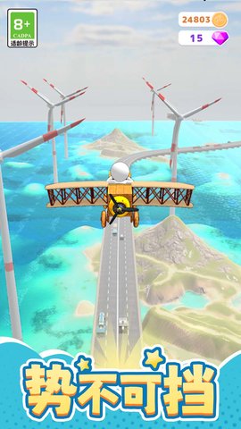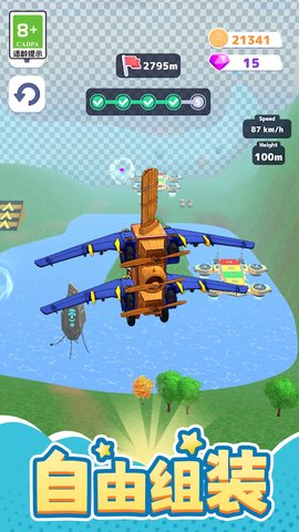 游戏具有简单的建造者游戏机制,玩家需要建造飞机并合并飞机部件以提高飞机的速度,还可以自定义飞机以获得最佳性能。在玩家将学习飞行知识,掌握天空中的速度艺术,体验飞行的乐趣。