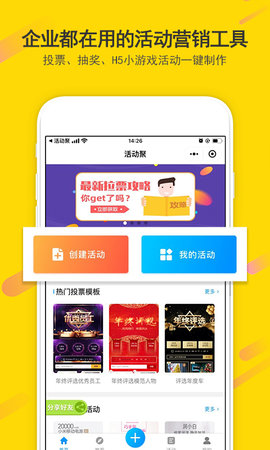 活动聚提供免费的h5页面制作工具,让您能够关注用户、引流流量、促销产品。活动聚拥有上千款h5游戏模板,任何人都可以零门槛地快速创建微信活动,一键发布活动信息,实现裂变式吸粉效果。您可以免费制作大转盘、抽奖、砍价、砸金蛋等微信小游戏,吸引用户参与,提升活动的趣味性和互动性。