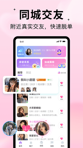 除了漂流瓶功能外,这款应用还是一款同城交友聊天软件。它为同城附近的陌生单身男女量身定制了聊天交友社交平台。你可以与陌生人聊天交友,寻找合适的对象,或者结识有趣的灵魂。这里提供全天在线聊天的功能,让你可以随时分享生活的点滴,聆听对方的语音。你可以开始一场甜蜜的随缘之旅,也许你会在这里脱单,遇见属于自己的爱情机会。