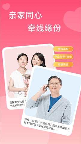 亲家相亲为那些忙于工作的孩子提供了一种全新的相亲方式,我们的平台帮助家长为孩子找到理想的结婚对象,即使子女不在身边也能为他们牵姻缘。我们深知孩子的幸福与安全至关重要,平台有专人进行信息真实性核验,确保相亲资料的真实可靠性,为孩子的幸福保驾护航。