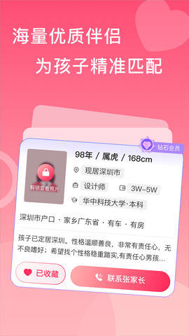 亲家相亲是一款专注于相亲服务的应用,我们提供真实可靠的信息,通过多维度偏好筛选,确保精准匹配,让您的孩子能够开启更多可能性,解锁周边城市的缘分。在亲家相亲的钻石专区,我们将与您携手,共同开启孩子幸福婚姻的美好旅程。