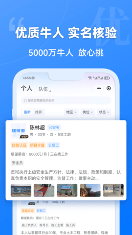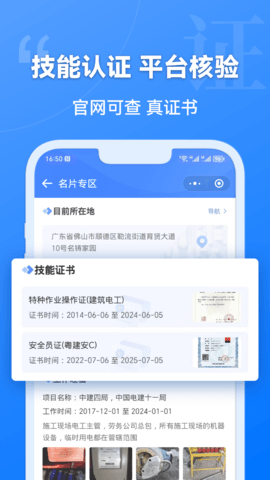 产品特色包括一呼百应的快速联系大量附近优质工人功能,覆盖全国34省、680+市区的工友社群,以及一键投递多个招工、老板主动联系的招工报名功能。用户可以预定好活,实时时间收到招工通知,以及实名认证、技能证书、项目经验等详细信息展示的工人名片功能,更了解谁看过自己的名片。