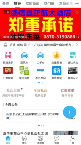 扎西微时空是一款集合了多种服务的综合应用,为用户提供丰富多彩的生活体验。作为扎西微时空的官方APP,威信新闻资讯栏目为用户提供了最新的本地新闻和生活故事,让用户第一时间了解身边发生的大小事情。平台还提供了同城信息发布功能,方便用户查找本地的团购优惠和美食推荐,让用户尽情享受威信本地的特色美食和生活方式。