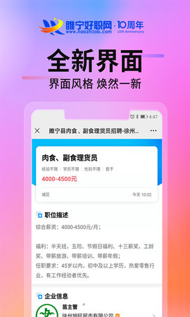 睢宁好职网还具有精准职位匹配的特色功能,根据用户的需求和能力智能匹配适合的高薪优选职位,为用户提供更加个性化的求职体验。用户可以通过睢宁好职网APP轻松地找到适合自己的工作岗位,实现职业生涯的突破和发展。