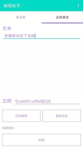 编程助手是一款功能强大的编程测试应用,提供了各种正则表达式匹配功能,包括手机号、邮箱、URL、域名、身份证、帐号、密码、日期、金额、QQ号、邮政编码、IP地址等。这些正则表达式的匹配功能可以帮助用户快速验证输入的数据是否符合特定格式,提高编程效率。编程助手还包含了丰富的面试题库,帮助用户更好地理解代码逻辑,提升面试技巧。