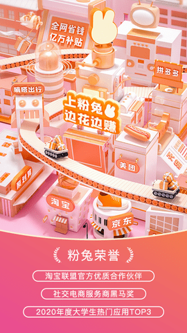 粉兔还提供更灵活的斜杠收入方式:如果你立志成为一位斜杠青年,只需将粉兔一键分享给好友,你省时间,TA省钱,共同享受购物的乐趣。粉兔还拥有更有颜值的交互界面:超萌的粉兔等着你来撸,让你忍不住多看一眼,给用户带来更美好的购物体验。