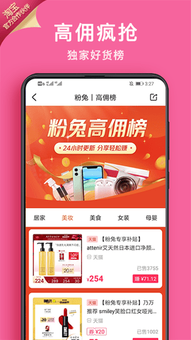 粉兔是一款返利应用,为用户提供更简单的优惠查询方式:在购物前先使用粉兔领券下单,享受返利,让每天都像是双11一样的优惠盛宴。粉兔还提供更优质的购物入口:精选主流电商平台上的商品,让用户能够在这里找到他们经常逛的那些平台,还可以比较同款产品的价格,再也不用担心花冤枉钱了!