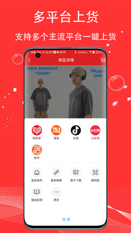 五二电商园平台支持多平台一键上货功能,包括淘宝、天猫、京东、拼多多、抖音等知名电商平台,用户可以足不出户即可轻松赚取利润。无论是寻找潮流服装货源还是其他商品,五二电商园都能满足用户的需求,为用户提供便捷、高效的购物体验和赚钱渠道。