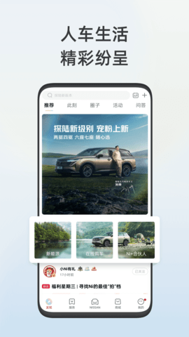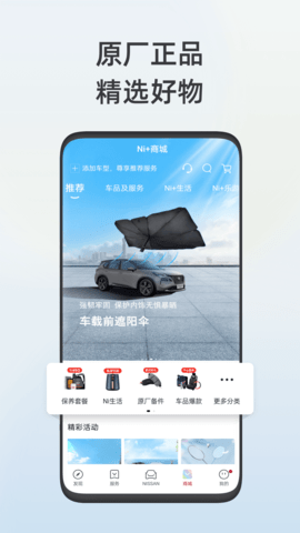 东风日产还提供商城服务,为用户提供更智能更便捷的出行服务,共同创造更美好的人、车、生活。用户可以在个人首页发现社区提供的新鲜资讯和活动,参与NI+社区/圈子的互动,还可以参与专家问答等服务。用户还可以预约维保、救援出险,查看网点等服务,购买原厂备件、精选好物、生活电器等商品。