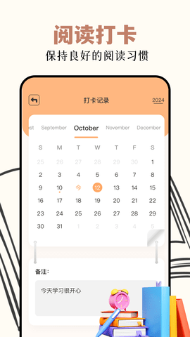 除了作为阅读工具,读书阁还具有日常打卡和随心记录的功能。用户可以利用日常打卡功能帮助自己养成阅读习惯,合理安排每天的阅读计划。随心记录功能让用户可以随时随地记录灵感,添加笔记,方便用户在阅读过程中做出思考和总结。