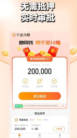 千金分期是一款专注于分期贷款的应用,其借款利率在2%至24%之间(单利计算)。这款应用的产品特点主要体现在为用户提供一站式的借款服务。用户可以通过免费测试信用额度来了解自己的借款能力,软件提供的借款额度范围广泛,从1000元到200000元不等,可以满足用户不同的资金需求,解决日常生活中的资金周转问题。