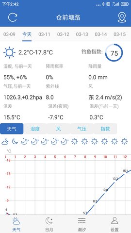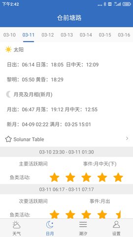 除了水温、大气压和风向等因素外,降雨和湿度也会对钓鱼活动产生一定影响。钓鱼天气应用提供了主要港口的潮汐和海浪预报,钓鱼人可以通过这些信息更好地选择合适的时间和地点进行钓鱼。钓鱼天气还提供了每天的日出日落、月出月落、月相等信息,据资料显示,鱼类在日出日落、月出月落前后30分钟内活动较为活跃,在月中天前后1小时内更是如此。特别值得注意的是,在满月和新月这两个月相时,鱼类的活动会更加频繁。