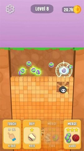 2、游戏提供了多种挖掘工具,玩家可以控制小球进行挖掘,同时需要躲避各种障碍物,赚取金币和奖励。