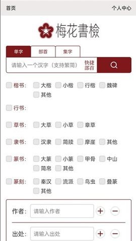 梅花书检是一款非常实用的应用,它为书法爱好者提供了一个学习、交流和展示的平台。该应用中包含了众多优质的书法作品,涵盖了草书、行书、楷书、篆书、隶书、篆刻等多种书法类型,用户可以随时随地进行在线查询。此外梅花书检还提供了部首查询功能,用户可以通过输入书法家的姓名或者作品名称进行查询,非常方便快捷。