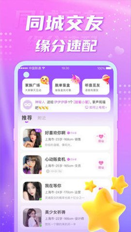 2、同城交友功能让用户能够一键搭讪同城附近陌生人,探寻海量单身优质异性,线上立刻就聊,线下见面约聊,快速脱单,来场不一样的同城约会!缘分速配功能帮助用户精准推荐更适合自己的TA,拒绝尬聊,让用户倾心畅聊,告别孤单!聊缘App还提供了视频约会功能,用户可以进行视频聊天速配,真人视频拒绝照骗,带你高效探寻同城单身高颜值男女,享受零距离社交体验,俘获TA的芳心。