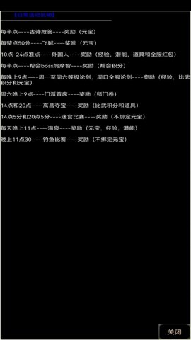 1、每天晚上9点开放各等级段比武,周一和周四为新锐(199-500级)论剑比武,周二和周五为天罡(501-1500级)论剑比武,周三和周六为(1501-3000级)论剑比武,参与即可获得千万经验奖励,前三名将获得状元、榜眼、探花称号。