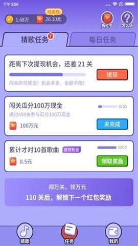 1、猜歌赚赚赚红包版是一款趣味性十足的猜歌休闲红包版游戏。