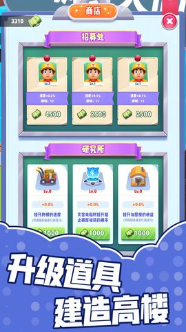 3、玩家还可以招募工人帮助自己建造房子,升级技能,筑成高楼突破天际。