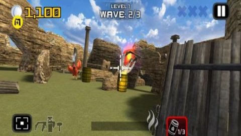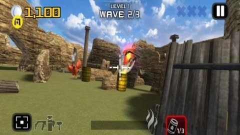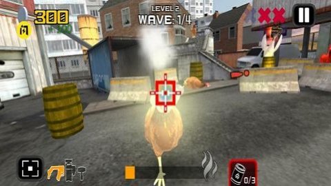 1、游戏操作非常简单,玩家只需要掌握丰富的枪战策略,使用各种武器来对抗大量的鸡群,并在不断升级的关卡中获得更高的得分。