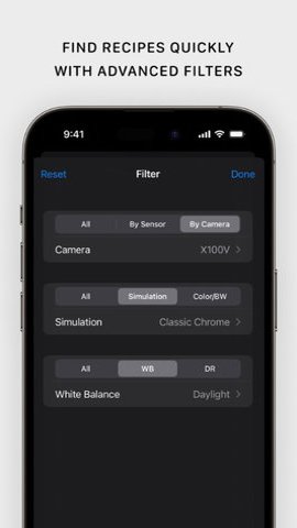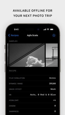 1、该应用程序支持富士X每周,您可以通过成为赞助人来充分利用富士X每周-电影配方应用程序!此外该应用程序还提供了ISO自动和最高ISO6400的选项,以及快速查找与您的相机兼容的胶片模拟配方的功能。