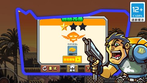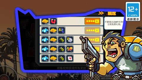 3、游戏采用2D横版枪战闯关模式,玩家需要不断升级自己的武器装备,提升战斗能力,完成任务,成为市民心中的英雄。