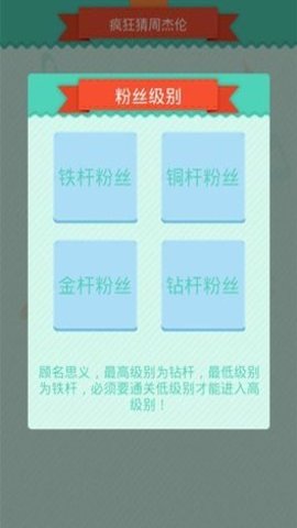 疯狂猜歌周杰伦版是一款备受欢迎的游戏,其中包括四种不同的等级,分别为铁杆粉丝、铜杆粉丝、金杆粉丝和钻杆粉丝。每个等级都有一百多个关卡,让玩家在游戏中边玩边回味,感受周杰伦音乐的魅力。