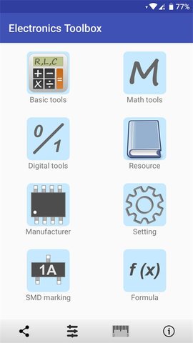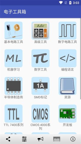 1、电子工具箱App的功能非常强大,它包括了从基本的电路工具到机器学习,从编程语言到SMD标记,从学习资源到数学公式等各种功能。