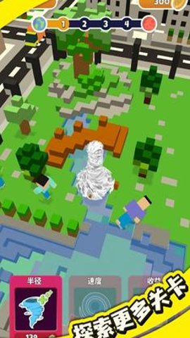 2、玩家需要留意地图上的其他物品,例如树木、房屋等,不断卷起并摧毁这些物品,增加得分和能量。