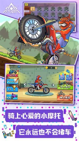 1、玩家可以选择不同的摩托车进行闯关,每一辆摩托车都有独特的属性和特点,玩家需要根据关卡的要求选择最适合的摩托车进行挑战。