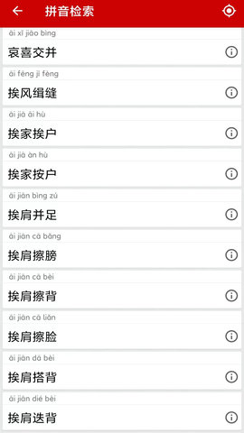 除了按照分类检索,用户还可以通过输入组成成语的一或多个字的拼音来检索。输入biao li ru yi就可以检索到成语表里如一。用户还可以通过输入组成成语的一个字的首字母来检索,输入B就可以检索到以B开头的成语。