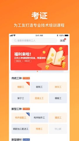 1、此外墨斗工约app还提供了考证功能,用户可以在软件中报名学习课程,以学习更多的技能,更加轻松地求职。
