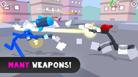 3、游戏中还有1对5混乱火柴人战斗争,基于布娃娃机制的横版格斗战争游戏,玩家可以操控自己的火柴人布娃娃加入这场战斗,解锁更多的武器道具,一起完成格斗对决,享受格斗的乐趣。