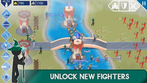 1、训练弓箭手、剑士、矛士等不同类型的火柴人战士,并解锁巫师等更加强大的战斗单位。