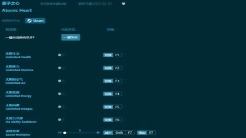 1、使用这些功能非常简单,只需要点击原子之心修改器中的开关来打开不同的修改即可。