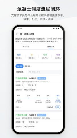 3、数字土木通还支持技术员与拌合站站长在手机端便捷下单、接单、配送、签收及调度便捷收发料与盘点。