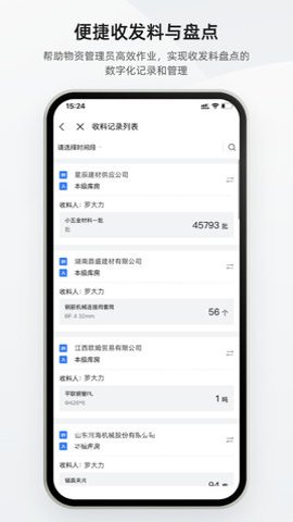 3、数字土木通帮助物资管理员高效作业,实现收发料盘点的数字化记录和管理业务应用入口集成。