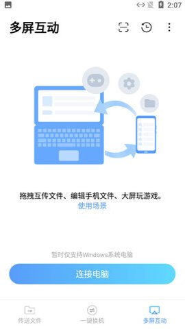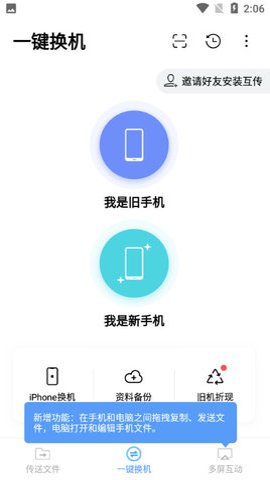 2、主界面默认在传送文件功能上,点击一键换机可以切换到一键换机功能。