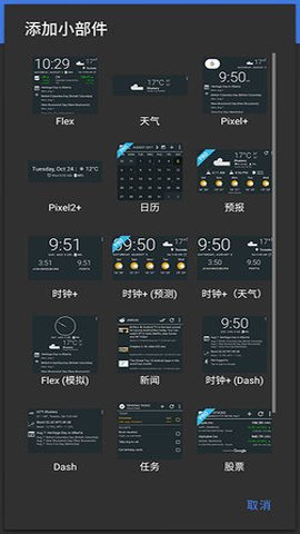 2、此外Chronus天气时钟还提供了多种小部件选择,例如Flex、Flex(模拟)、时钟+、时钟+(Dash)、Dash、Pixel+、Pixel+、消息、任务与天气小工具,以及更多的小部件,例如预报、日历、Clock+(预报)和股票。