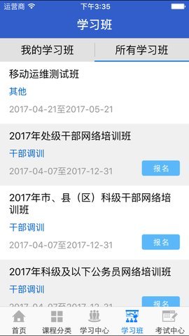 1、首页已报名学习班、未报名学习班为组班形式的学习,让学员可以轻松参加学习班,提高学习效果。