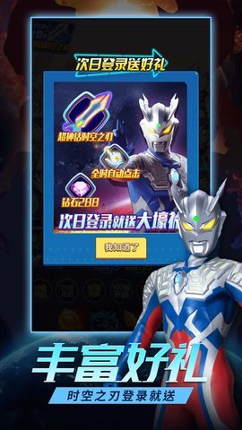 2、游戏提供了丰富的游戏玩法模式供玩家选择,包括奥特集结协同作战和疯狂点击无畏闯关等。